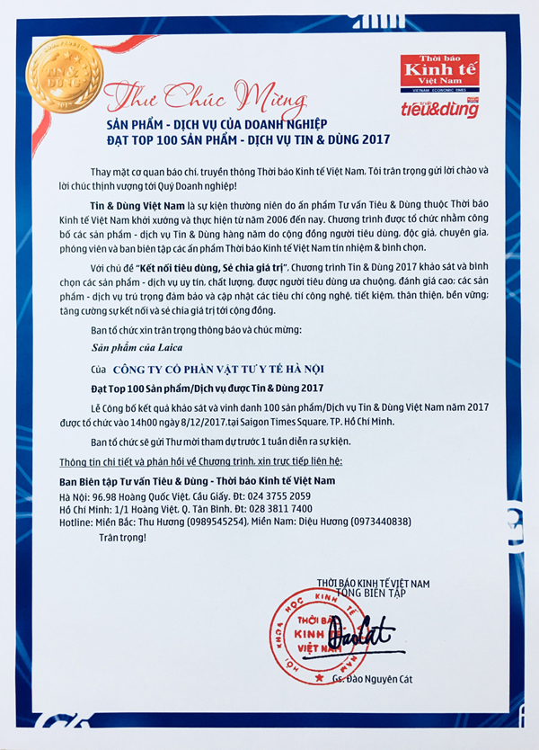Tại buổi lễ tôn vinh, các sản phẩm chăm sóc sức khỏe, sắc đẹp của LAICA Italy đã vinh dự nhận danh hiệu “Sản phẩm và Dịch vụ Tin & Dùng 2017”. Đây là lần thứ hai thương hiệu LAICA Italy vinh dự nhận được giải thưởng này nhằm ghi nhận những đóng góp bền bỉ của LAICA Italy suốt 15 năm qua tại Việt Nam, trong việc phát triển sản phẩm mới, tiện ích, thông minh để chăm sóc sức khỏe cộng đồng theo tiêu chuẩn Quốc tế.
